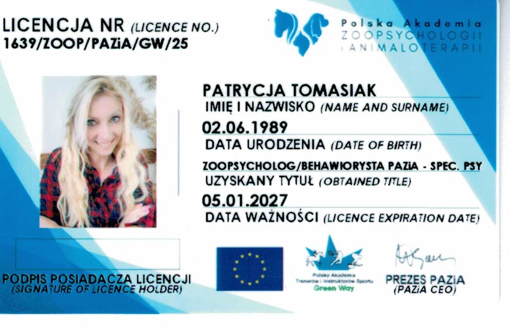 Nazywam się Patrycja Tomasiak. Jestem certyfikowanym behawiorystą psów — uprawnienia zdobyłam w Polskiej Akademii Zoopsychologii i Animaloterapii, a wiedzę stale poszerzam. Pracuję spokojnie i indywidualnie, a moje podejście buduję na obserwacji, relacji i realnym życiu z psem.